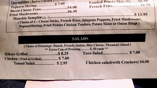 Great place to get good hot & cooked to order food 24hrs a day. From steaks, grilled ham and cheese, GREAT Club sandwich, onion rings, salads, nachos, wings, appetizers like most places, ribs, vegetables, grilled burgers... so much better than having to go to Krystals or Taco Bell, more variety than Waffle House. Bartenders are so friendly and good about remembering your name and drink. Dont want to take a 1st date here. Gets loud with pool & dart games. Music in jukebox. Lots of rap played. NOT fancy or up-to date with decor. So either go to eat or get it to-go, late night place when everything else has closed or just sit at bar and talk to folks. Most time the Security guy takes up money but if youre just going in to get food theres no cover chg.