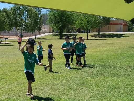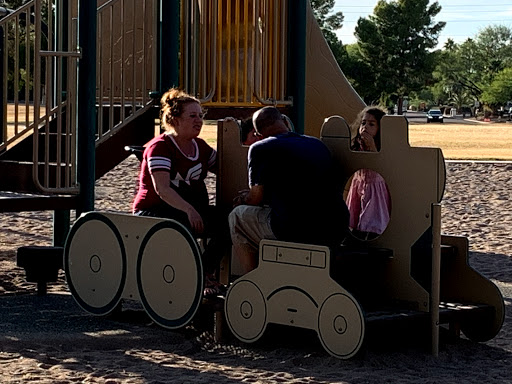My review of Sereno Park: I love seeing a public park that caters to Horse lovers. The west side of the park has hills that cut out the noise of traffic from the road The is a corralled sand field with jumping equipment there and another large open sand field near by for Equestrians. The ground squirrel holes made me nervous. The east side borders a school. There is a large parking lot in the center of this park where you can find decent bathrooms and a sand filled playground. I loved the train themed play equipment. There is a baseball field that is recessed down in the ground to give some shade there. A cement walkway cuts straight through the park from the parking lot to the road on the North border. There are picnic tables under some of the trees and a few barbecue grills near by. All in all a very nice park.