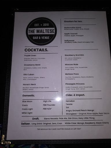 The Maltese does an excellent job of providing entertainment and culture for the Chico community. It seems that there is some form of event every night. The pricing is quite reasonable, & the service is exemplary. It is my favorite bar in the area.