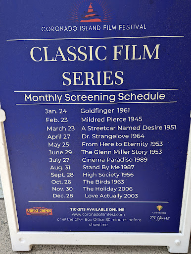 This is a smaller movie theater in the heart of Coronado California. It was built in 1947 I believe and it has a main screening room that holds a good amount of people and 2 smaller rooms that hold 34 people each. I love the vintage feel and the popcorn is really good.