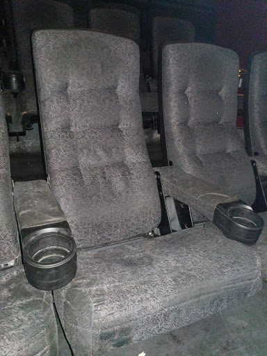 Messy theater, food stained upholstery all day long into the next day and the next. What do you expect when you have kids in and out of the theater and kids employed there and half-ass parents who dont practice a little courtesy and pick up after themselves? Cmon now. So just be careful when entering! Think about how you lean your head back too...ya never know what is crusted up on that part of your seat!