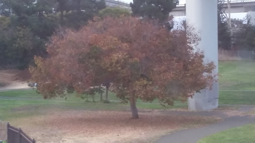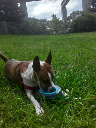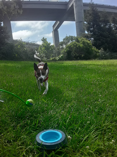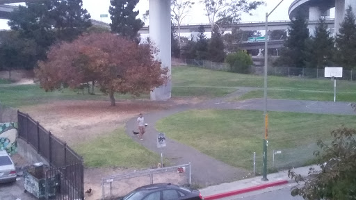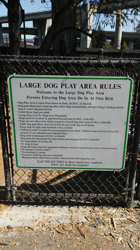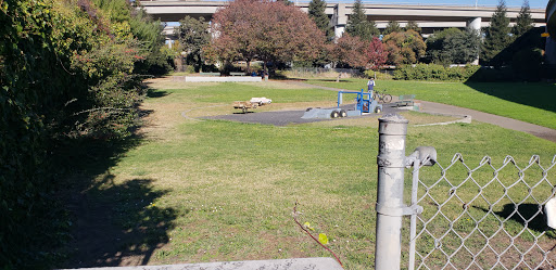 Dog park near my house-! Lots of potential. This park is separated by the freeway ramps. North portion of the park has a court yard where you can play basketball games, skate, dog walk, etc. South portion is smaller, but quieter. Oakland City cleaners cleaned the park through out and its a lot cleaner now. Lets keep it that way folks-! ^.^ so happy to have a gated leash free dog park nearby my house. 5 stars for its potential :)