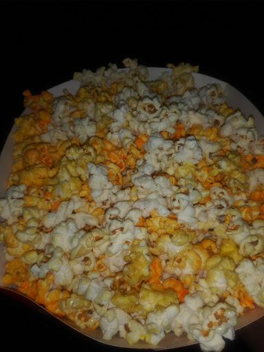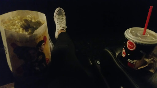 This movie theater is kind of awkward. There are two sides to the food station, but Ive only ever seen one side open at a time. The food selection is one step above basic movie theater options. They offer snacks like beef jerky, a couple pizza choices, and super nachos with salsa, sour cream, olives, and guac, just to name a few. The food line is a little unorganized though. There are foods you can pick up on both sides of the line so people are kind of bouncing back and forth before they reach the check out. The theaters themselves are split up into two separate hallways. So if youve gone through the whole food line, youre standing directly in front of one hallway, but that hallway may not be the one your movie is in (it never is for me). So you have to walk all the way around all the food areas to the other side of the theater. Not a huge deal, just like I said, awkward. The theaters themselves are usually fine. Things can be a little sticky during the late night movies. But the very back row has extra floor space. Great leg room for tall people like myself.