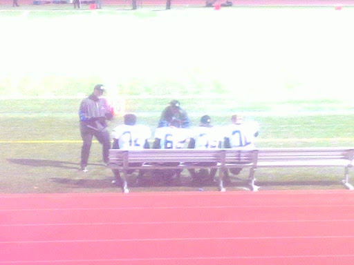 Blah. What kind of high school stadium charges admission for a run of the mill track meet that your kid is in? This kind of stadium. Nice fake grass. Whole place reminds me of a prison yard.
