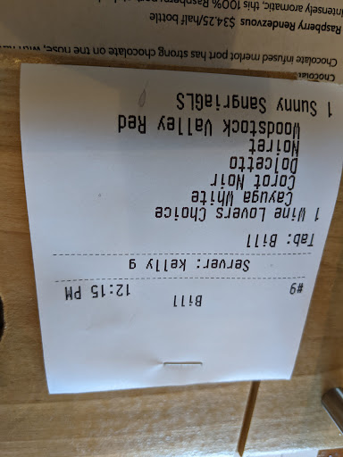 Love all the wines! Great informative staff. Nice place to bring a lunch, cheese and crackers or shrimp cocktail and have a bottle of wine. As the weather gets colder they have a pellet stove to ward off the cold.