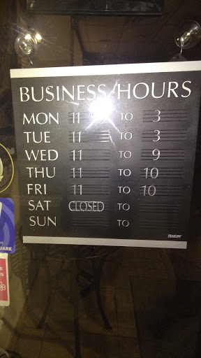 | Working: | 11AM–3PM 11AM–3PM 11AM–9PM 11AM–9PM 11AM–10PM 5–10PM Closed |