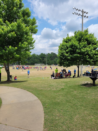 Park for soccer enthusiast. This park is great for practicing your soccer game. Many tiny league games are held here and the landscaping is always well kept. The park includes a small area playground for kids and a walking path that circles the park which is great for walking the dog or having that morning run. Lots of bio bag structures around the park and a doggie fountain for your pet. The park is also adjacent to Fire Station no# 3 and is across the street from a family Dollar convenience store. The park can become quit crowded during the kids soccer games but this park accomodates a huge parking lot with handicap parking and a restroom facility. There are benches around the park and a shaded sitting platform to keep you shaded from the Georgian extreme heat and sun.