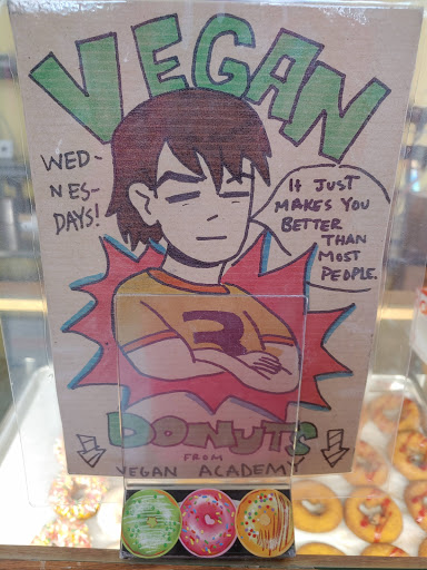 Donuts are pretty bland and taste slightly like dish soap. Staff is terrible. Went there for a dozen donuts for the office and a coffee drink, there was one man in front of me in line who had ordered a drink. Three girls were just standing around gossiping while one was making the drink, I didnt get acknowledged until a solid 10 minutes later. There was no sense of urgency and it made me late to work. I have a similar experience every time I go in here for office donuts. This is the place I would always go to buy them, because I try to support local businesses, but they dont seem to care about the customer so Ill no longer be going here. The only reason this is two stars instead of one is because they have vegan donuts on Wednesday which is pretty awesome. They sell out of them pretty quickly though so I wish they had them every day!