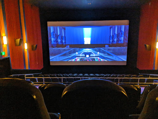 The theatres have been nicely redone, but it only goes as far as the seats. The building is too small, so the theatres are too small, resulting in really awful viewing angles in the seats below the walkway (top half of screens appear dark at those angles) and always having to crane your neck. We always sit in the first of the top rows because of this, but then you have to deal with the LEDs lighting the walkway and the bright green exit signs in your peripheral. I understand why theyre there, but they glare heavily on my glasses and the light strips shine up into your eyes. In addition, the overhead lights stay on during previews, and certain seats get the "spotlight" (like the middle of the first row in the top section...). I wouldnt mind these things alone, even with the addition of the overly high volumes (probably to cover the noise of other audience members, a reason we try to see movies around noon on weekdays). But the thing that gets me more and more are the awful aberrations in the screens (or the projector lenses). Ive seen white and/or dark spots in several theatres, and many have a burn spot in the middle that seems more reflective (more white) than the rest of the screen. We see a movie a week and I can often look past these things, but todays screening of Born in China was all but ruined by the thick, off-center magenta vignette that marred the picture throughout the film. See my pictures. This was in theatre 9, so at the very least, dont see a film in that one. $12/person is too much to charge for the viewing experience gotten here.