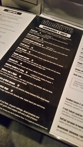 Poor service. Bad food. What a disappointment! We originally liked Cinebarre and thought it was a great idea to catch a "movie and dinner." When they first opened the service was attentive and the food mediocre. Over the course of time, both service and food have nosedived. This afternoon, my husband and I visited Cinebarre. We arrived 15 minutes before the movie, wrote out our snack and drinks as we have done in the past. Nothing happened and no one showed up to take our order. 45 minutes into the movie I slipped out to the restroom, passed a server up at her station chatting, and asked her to take our order. She wanted to know if I had brought it with me. When I replied in the negative, she got it. However, delivered the wrong food and disappeared. 10 minutes before movie end, she delivered the bill, but neglected to return for it. I took it to her. Her excuse was she was "slammed" and didnt like our movie :) I doubt if there were 20 people in all the theaters, but I do appreciate her movie criticism. I didnt like it either, but most especially, I didnt like her attitude. We wont come back. We have given this several tries. Service has declined steadily over the last year as has the quality of the food. We will go back to regular theaters and dinner after.