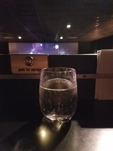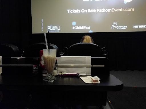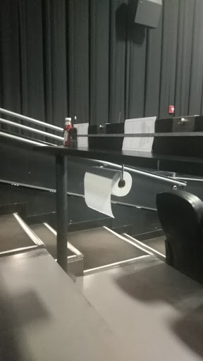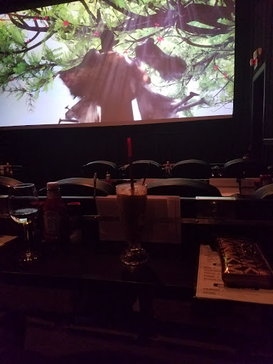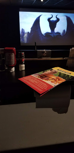 HI. i bought my tickets at the box office, staffed by 3 sullen, attractive teenagers. a few moments after the movie started, the ventilation system kicked in...which created a low industrial hum that we had to listen to, throughout the movie. the image on the screen was a bit compromised by a bright light from the camera room, that leaked onto the lower right hand part of the movie screen. our "waiter" was a good guy, very enthused and explained how it all worked. the paper towels are under the table in front of the seating, hanging in much the same way toilet paper is suspended on the side of the stall in a restroom. this grossed me out, slightly, as did the stickiness of the menus themselves. the restroom smelled richly and aggressively of urine cakes (those white discs that you find in urinals) and Mr. Clean. on the plus side, the entire experience was very affordable. i give this establishment the highest marks!