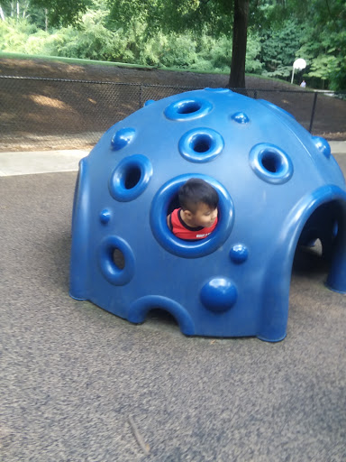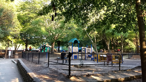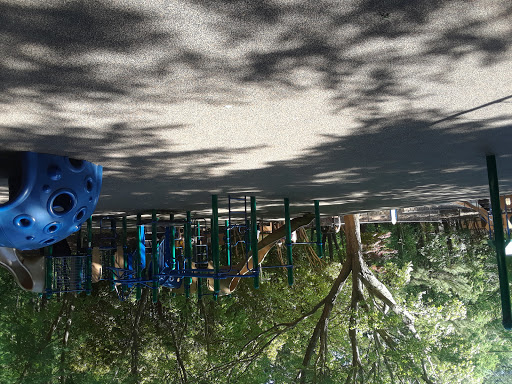 It has one of the few completely fenced in playgrounds around. The play area has rubber padding, two jungle gyms, lots and lots of shady trees, and is a great place to meet people. Only real cons are: its a bit short of parking space and restroom availability is unpredictable.
