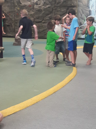 Amazing indoor playground complete with eight or so feet rock wall for the kids! Its not the biggest place around but its great for rainy days or way-too-hot North Carolina summer afternoons! Theres a snack machine and drink machine and you can brink your own as well. Kids have to remove their shoes to play so keep that in mind. The space can be rented for private birthday parties so make sure to always call ahead to check their hours.