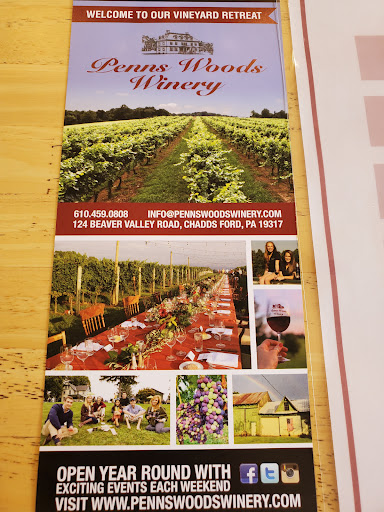 If you think PA doesnt craft great wines, then you havent been to Penns Woods Winery in Chadds Ford. Youll enjoy award-winning wines, great service and a fun atmosphere. Learn as much or as little as you care to know about wines. They offer 2 flights to taste - a lighter, fruitier variety as well as a dry flight, mixed with whites and reds. Something for everyone... quaint farmhouse, romantic setting and a nice experience. Reasonably priced and you leave knowing your visit was appreciated.