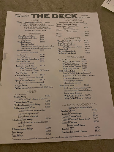 The deck is a great place to go if your are looking to enjoy the nice weather and have a few drinks. The service and seating is not the best as they are usually busy all the time. Parking can also be limited. Ive never had an issue with the food but most people go here for the atmosphere alone. They have tvs always playing the games for those of you who enjoy sports.