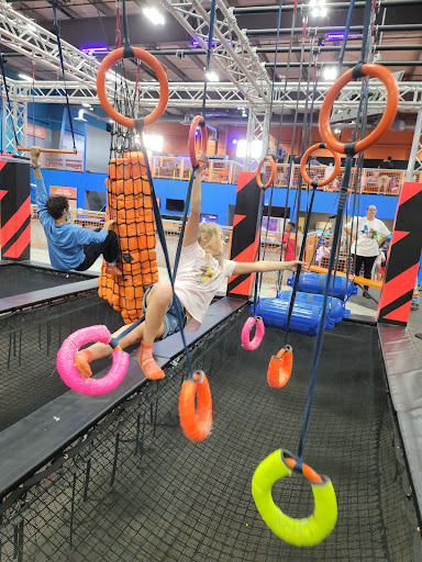 Its busy, the time slots are a little annoying, and the waivers dont transfer with other sky zones. That all doesnt matter that much as the price is right and its a lot of fun. Theres 4 trampolines that jump into foam pits where you can spin and do front flips, but no back flips. Theres 3 basketball hoops at different heights which you can try to dunk in. One is reserved for younger kids. Theres 3 seperate dodgeball areas with a grid of trampolines. One is reserved for younger kids. Theres one large free jump area with grids of trampolines where front and backflips are allowed. Kids are separated into their own area unless parents want them near. Theres a lot of rules, but most are sensible and the college age kids enforcing them are fairly lenient. There are obviously kids everywhere you have to watch out for, but it still isnt a bad time for adults who want to get some exercise.