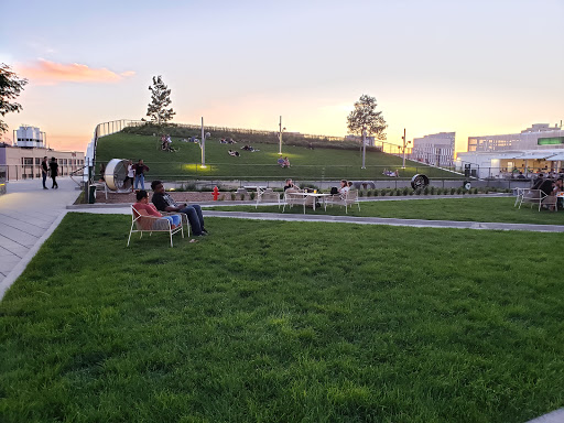 A nice green spot to get away from the city. Over a parking garage and sandwiched between two Towers - Evo and the FMC Tower. Some stone steps and grass throughout are nicely maintained. Bathrooms available but not heated. Would be better with some actual seating.