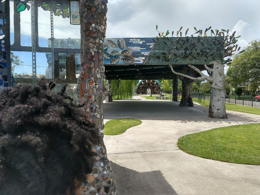 Public, recycled art displays along a small park amidst a community. Water bottles, plates even empty nail polish is used to create the most unique art Ive ever seen.