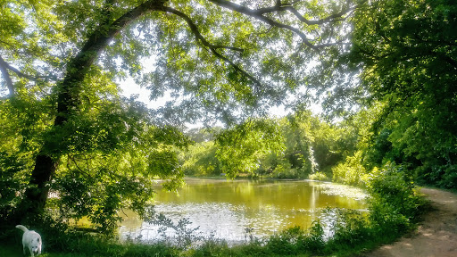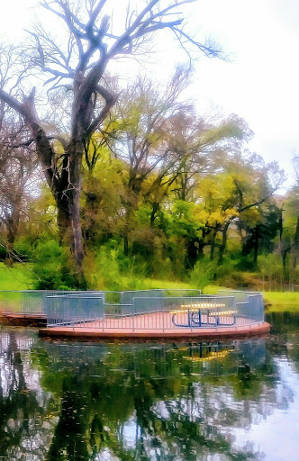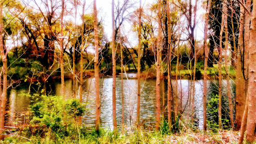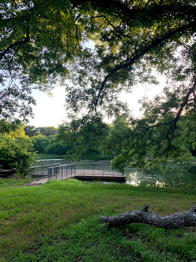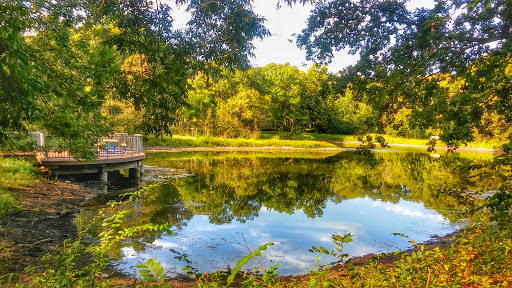 has a large pond with a dock, nice park