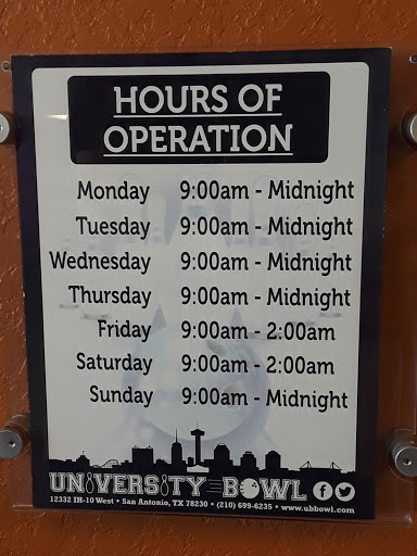 University Bowl is a great place to take the family and have fun. Arcade games, snack bar...oh, did I mention BOWLING? Despite the negative reviews here, I have been several times and never had a problem with the staff. There are two things to remember with any bowling center: 1) league nights, usually Tuesday, Wednesday and Thursday, and Friday/Saturday evenings are busiest for open bowling, so get there early for best lane action and to guarantee that you will get a lane. 2) You will be treated in the same manner you treat others. Remember the old adage "Do unto others"? Well, thats true anywhere. If you treat the staff like crap, you will get crap service. Be patient, kind and understanding. If the parking lot is full, chances are that the bowling center is busy. Please take that into consideration. If you really are hoping to bowl, then I suggest going during a slow period, like during the daytime hours during the early part of the week. Another thing: the bowling center snack bar. They depend upon your hunger to make a buck. Many, if not all, bowling centers frown on outside food being brought in, so dont get upset if they make you take your Whataburger outside to eat. The snack bar is there for a reason. Yes, I know most bowling food is not gourmet, but cut them a break. Its not *that* bad. Bars in the bowling center. Yes, many bowlers like a beer or two during the game. Check with the center on prices. If you dont like the beer prices, dont buy them. No one is forcing you to drink beer. Have a soda or water instead. Smoking. Many centers do not allow smoking. UB is no exception. I am still hearing griping from the Bandera regulars about how they got kicked out. Oh well...it is up to the management to determine that, and many in the SA city limits do not allow it thanks to the new ordinance. If it bothers you...oh, well. Anyway, if you go during a league night, always remember that the league has priority...always. Leagues are treated as royalty because they have already paid to bowl. My reviews on UB and Bandera are not biased because I like to bowl. I also work with the high school bowlers and Special Olympics athletes.