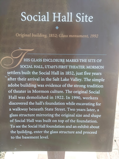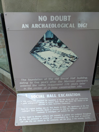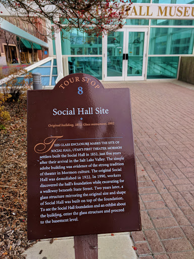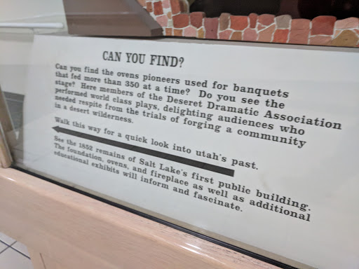 This is a fantastic little museum about the archaeology under the streets of Salt Lake City. It is connected to a tunnel that runs under State Street so this is a great way to cross State Street and experience some of the history of the area. The structure above ground is meant to show what the old Social Hall would have looked like along the modern city streets. The exhibits focus on two aspects - the social life of early Salt Lakers (especially the Theater) and the archaeological discovery process that uncovered the foundations of the old Social Hall. I am really fascinated by archaeology and I find this museum to be delightful. It is small and only contains static displays and no staff. However, it is certainly worth a quick visit to check it out.