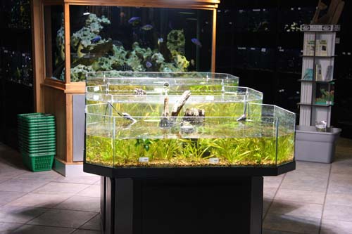 This is the fanciest fish store Ive ever been too! It was obviously master-planned from the beginning with how the fish tanks are built into the walls which are curved and scalloped into little enclaves. What impressed me most was the condition of the tanks- ALL crystal clear water with fish swimming around and looking happy overall. They have a saltwater only enclave section that was mighty impressive- section and sections of corals and similar saltwater plants nicely organized for display and sale, and they had some very interesting invertebrates and creatures (nice marine shrimp selection). I dont have a saltwater tank but just going through this section made me want one! Other than the beautifully-presented fish, they have quite a lot of supplies. What most impressed me was the depth of items they had- such as the hard to find substrates that are packed in water with bacteria (they even had mini versions of these to help your betta tank get cycled and ready to go!), marine substrates, some unusual (but very small selection) tank decor, etc. They had some nice decorative open tanks with apple snails and live plants, well-displayed empty tank setups for purchase... overall impressive! They have things that you wont find at the chain stores which was fun to find. Other than fish, they had an entire reptile section with some geckos, tarantulas, turtles, and some harder-to-find reptiles I forgot the name of, along with all the supplies you would need. Overall, not only did the fish/animals look well taken care of but you have an enjoyable time actually walking through and browsing this place unlike some other fish stores Ive been to. This is a great place to bring kids, just a great place overall! I did find it humorous that two people wondered into here looking for the "Living Planet Aquarium" just down the road. Must bring in some great business for this place. ;) Only downsides I found were the prices and the customer service. A few inexpensive fish I noticed the price of were priced $1-3 dollars higher than some other local fish stores. But this can be expected due to the look of this place and the great condition of the fish- and I dont mind paying a bit more if I feel my fish are well taken care of and wont have diseases. I also found the one worker who helped me only moderately knowledgeable, but I never trust fish store workers anyway- at least there were lots of workers around to ask for help if needed. Overall, impressed!