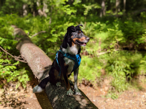 We live nearby so we often walk over to walk the trails here. Trails are marked and kept clear and there is some nice terrain, rocks to climb on, a stream to splash in. Not uncommon to see dogs, on our visits theyve always been on a leash or well trained; owners are respectful of others. Trails connect up to the Crossfields sports fields and you can access the playgrounds too.