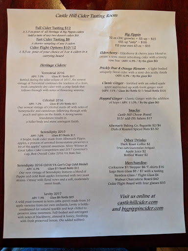 My wife and I made the 30 minute drive from Charlottesville to Castle Hill Cider on a Saturday. Overall it was a really good experience and well definitely be coming back. The drive is beautiful once you leave Charlottesville and get on to 231. The street is lined with large estates. It makes the drive genuinely enjoyable. Its worth noting that youll lose service at some point so dont quit out of Maps if youre relying on your cell phone for directions, you wont be able to open Maps back up and get directions again. The grounds are incredible. You drive in on their one lane gravel road, lined with shrubs, trees, vineyards and orchards. Their buildings are also fantastic. My wife and I both commented on how amazing this would be for a wedding venue. They have lots of parking, although on Saturday at 3:00 this was far from an issue. They have both indoor and outdoor bars and lots of outdoor seating. They also have bocci and corn hole outside and checkers inside. Dogs are welcome both indoors and out (at least when people brought their greyhound and another group brought their golden doodle indoors the employees didnt stop them). We opted for a premium tasting ($12, for 10 1-oz pours of cider). Initially we went for the standard tasting ($10, for 8 1-oz pours of cider) but with one tasting left we were given the option to switch and we decided wed like to try the two that were excluded from the standard set. Their samples go from dry to sweet and the two exclusions fit in at the end of that spectrum. They were worth an extra $4. This was my only complaint about this cidery, they have tastings instead of flights. Id much rather sit down with all of my options at once with written information and read through the differences while I make my way through the various ciders, rather than having someone give them to me in a set order, while I stand, and set the pace for me. They also have a "club" which you can join for free. This gives you two free tastings or two free glasses of cider per visit ($16 value, once a month) and a 20% discount on all of their ciders, with the commitment of buying three bottles of cider every three months (at that 20% discount). We like the grounds enough and the cider enough that well probably end up doing this once weve explored the area a bit more. We bought a $17 bottle of their Big Pippin (their cocktail cider), and if we drank one of these once a month we wouldnt be complaining. When our families come to visit well definitely bringing them by Castle Hill.