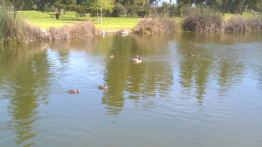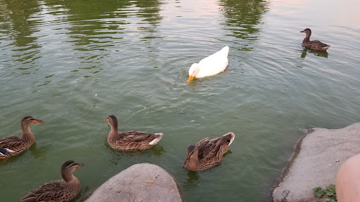 This is an extremely safe park with three separate parking lots, plentiful street parking, and easy pedestrian access all along the west and south sides. The north end of the park borders the Almansor Golf Course and shares a large two-tiered pond full of ducks. The resident ducks have become so tame that theyll waddle and paddle their way up to you at the mere hint of food. I dont think youre supposed to feed them but Id rather be gaggled than hear a kids tantrum. Some of the ducks even have nests and eggs along the protected bank of the course side. Great place to bring kids as long as you make sure they dont start climbing the rocks separating the tiers. The indoor gym hosts badminton and table tennis games in the evenings. The open air basketball courts are always packed with pick up jungle ball games from the afternoon into the night. The lighted tennis courts are especially busy at night. Theres a recently remodeled jungle gym and play area for the kids between the tennis courts and the track. The three baseball fields have a little league or softball games running at all times. The rubberized track along the south side has a constant flow of walkers and the occasional runner. Each quadrant of the track has a permanent exercise station for stretching or body weight exercises.