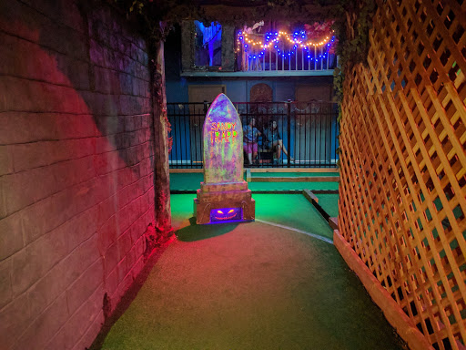 This review is perfect. Ill keep mine short. Really neat place, great effects, spooky atmosphere, looks like good times. Staff is good, clean restroom, there are definitely positives. Still, there are a too many things on the course that just kind of ruin the experience: Holes through obstacles are tiny, maybe 1.5 times bigger than the ball. Too many of the holes are on the top of these giant mounds. Not like the top of a hill with a flat part, I mean literally, someone sculpted a 10 inch mountain and put a cup in it. How are you supposed to hit your ball into it without taking 3+ tries? Basically, you can just hit the ball around and have some fun, theres nothing wrong with that, but its basically impossible to actually do well. It just takes away from the experience. Why is it so hard? Also, little girl was crying because of how scary this place is. It got my wife a couple times.
