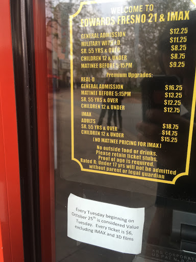 My Sweetie and I were in town for the State track meet, we had time too kill on Saturday so, we went to the Edwards Fresno. We saw Loweriders which was very good! Needless to say the movie theatre wasnt bad. Were movie goers and weve seen some good and some bad. This was not a bad experience although, I did visit the ladies room and it was not clean, note to mgmt please have the bathrooms cleaned regularly this is why I gave 3 stars and not 5. They were gross!!