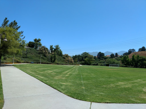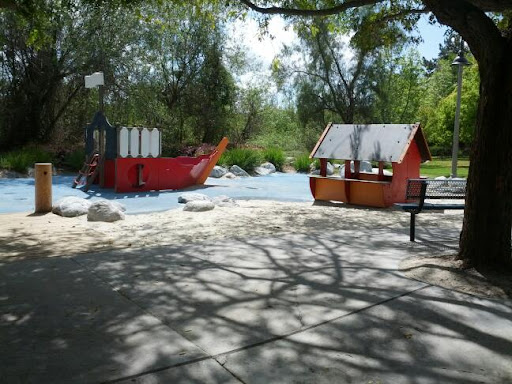 Great playground for kids. Away from the street, plenty of tables and benches, and plenty of shade. Two small BBQs available. Bring sand toys. One of the play strictures looks like a pirate ship so it would be a great park for a pirate themed birthday party. Would be five stars if there were a restroom. Great area for dogs to run as there are two soccer fields adjacent to the playground. Park on Pinecrest and walk down the hill to access the park.