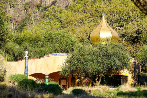 Yes, its a little difficult to find. At the end of a long private road, marked only by a sign with several addresses, off the Silverado Trail, there is this truly fantastic architectural confection. Welcomed by the genial and extremely enthusiastic host, eight or nine lucky people taste a range of petit syrahs and cabs, each one richer than the last. Along with the wine, the host presents a rich history of the place, including real estate intrigues, architectural oddities and just plain funny stories. The mix of Viennese, post-war whimsey, shimmering color and a successful attempt to use not a single straight line and windows and doors of which no two are alike, results in an afternoon of warm memories and a resolve to visit again with more fortunate friends.