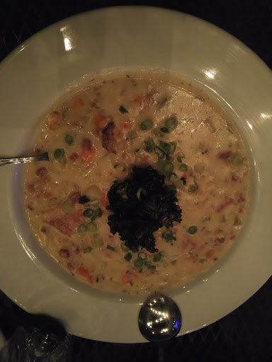 We ate in the dining room on the second floor, but can hear the live music that was playing downstairs. It was nice the we had the entire dining room to ourselves since it was late and most people were downstairs. Our server was smiling and attentive. He didnt rush us and brought the courses of food out hot and in good time. Our buffalo wings came first (chipotle flavor was delish), followed by house salad (spring mix, not watery iceberg lettuce). After our appetizer and salad plates were removed, our main entrees were brought out. Pan-seared Tornado Seabass was beautifully plated and topped with an orchid. It was too pretty to eat, but we were hungry. The seabass was tender and the squash, zucchini, and purple mash potato was seasoned lightly so that they did not conflict with the lobster sauce. Our second entree, Maple Airline Chicken, wasnt as fancy in appearance, but it was yummy as well. It was served atop gnocchi in maple cheese sauce.