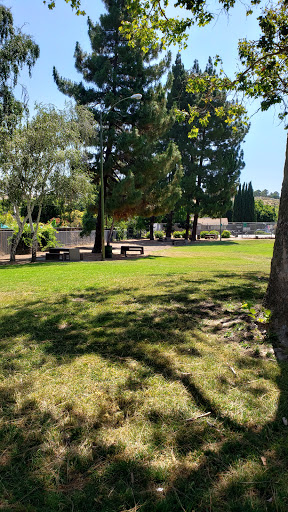 Park with a large lawn next to a school. It has a playground and tennis courts as well as picnic benches with grills.