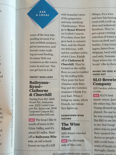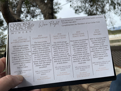 The Claiborne & Churchill Winery is a "must" for visitors to San Luis Obispo. Its located in the Edna Valley about two miles from SLO on Highway 227. Over the years, it has maintained its high quality wine and at an affordable price. The tasting room staff is pleasant and knowledgeable.